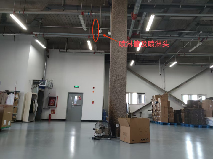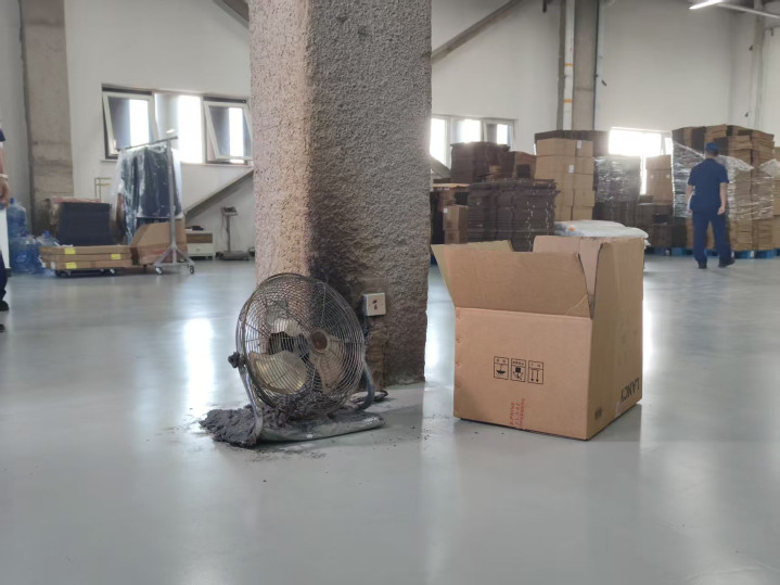 到场后,他们发现明火已经熄灭,现场遗留一个燃烧过的电风扇,喷淋系统正在向下淋水灭火。